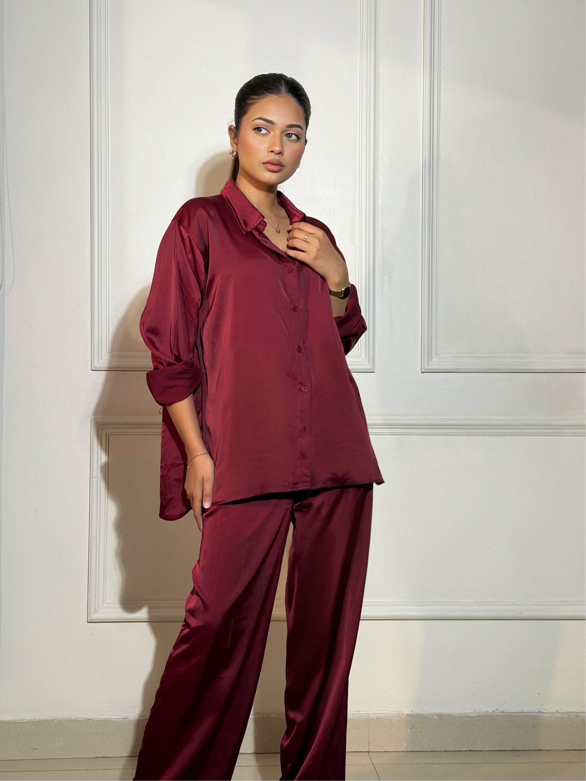 A shirt that feels like confidence poured in deep wine. Soft satin, easy fall and that effortless oversized silhouette that always looks intentional. Wear it loose for the laid-back power look or tuck it in when you want sharper lines.